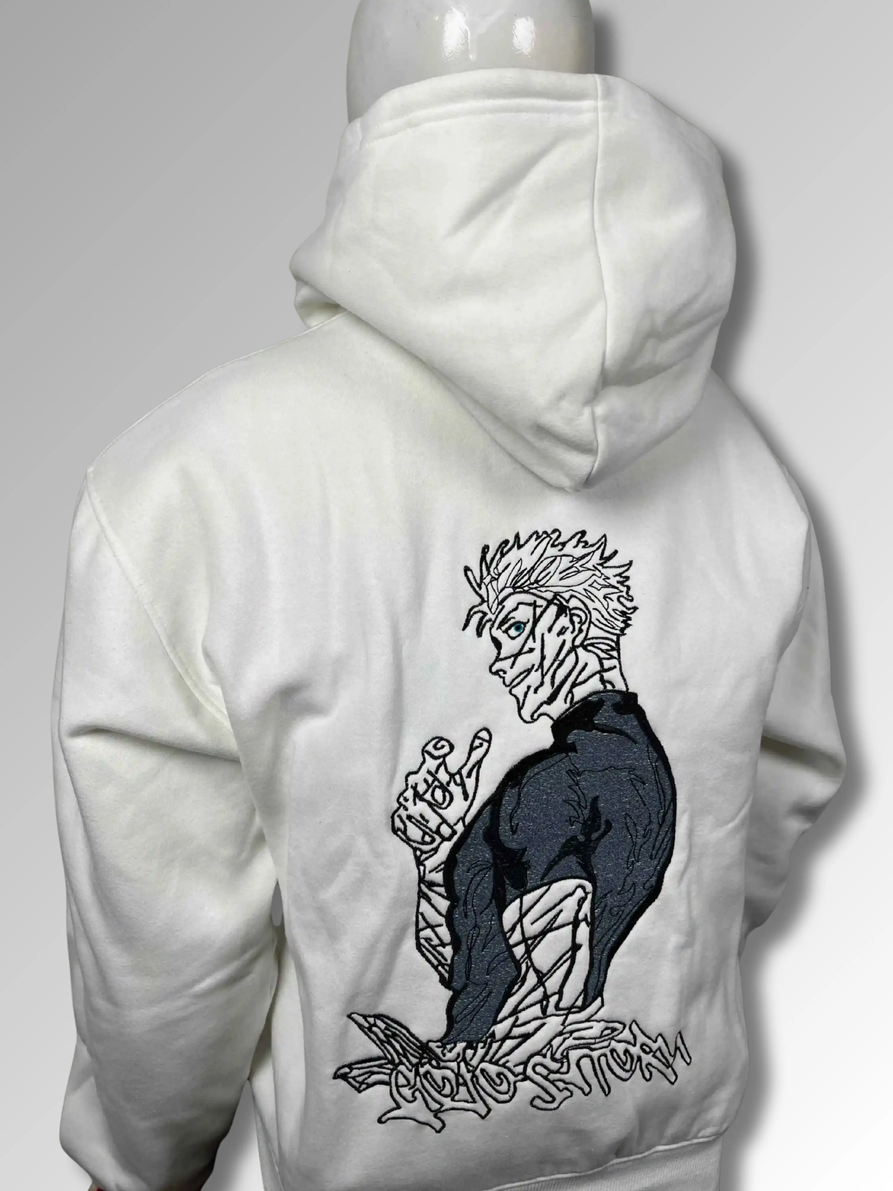 Premium cotton fleece hoodie featuring high-density embroidery details inspired by The Honored One, Gojo Satoru.