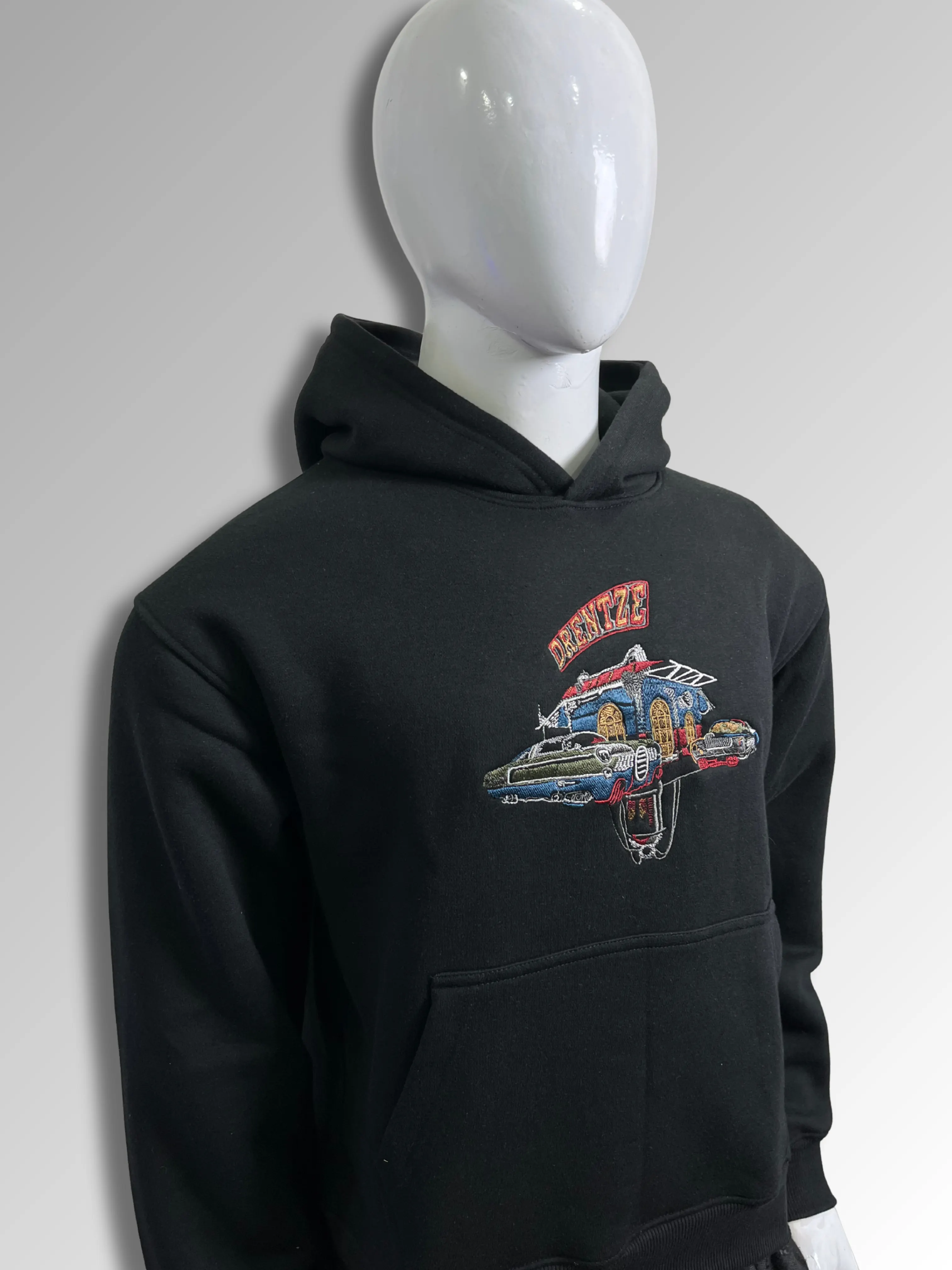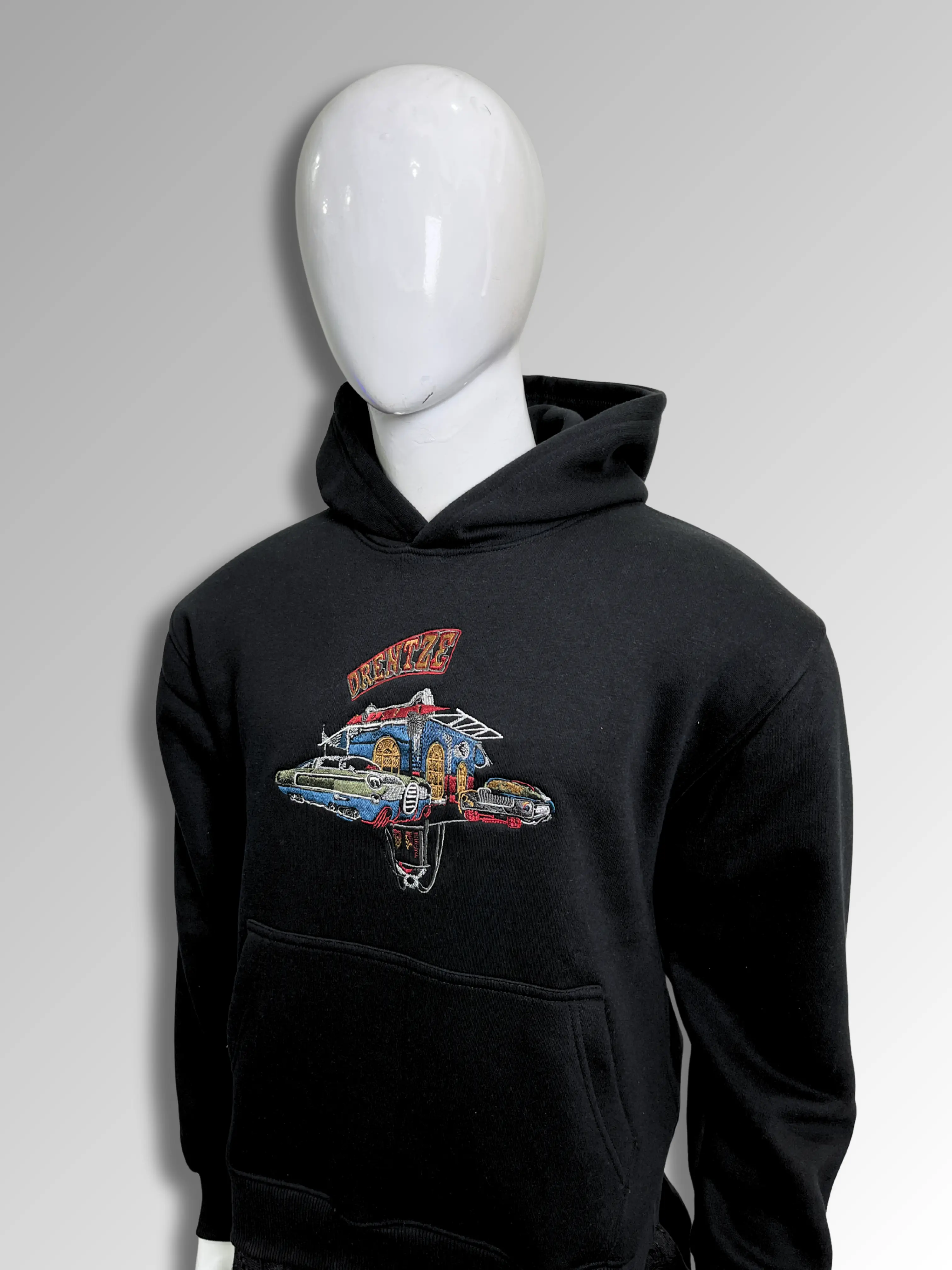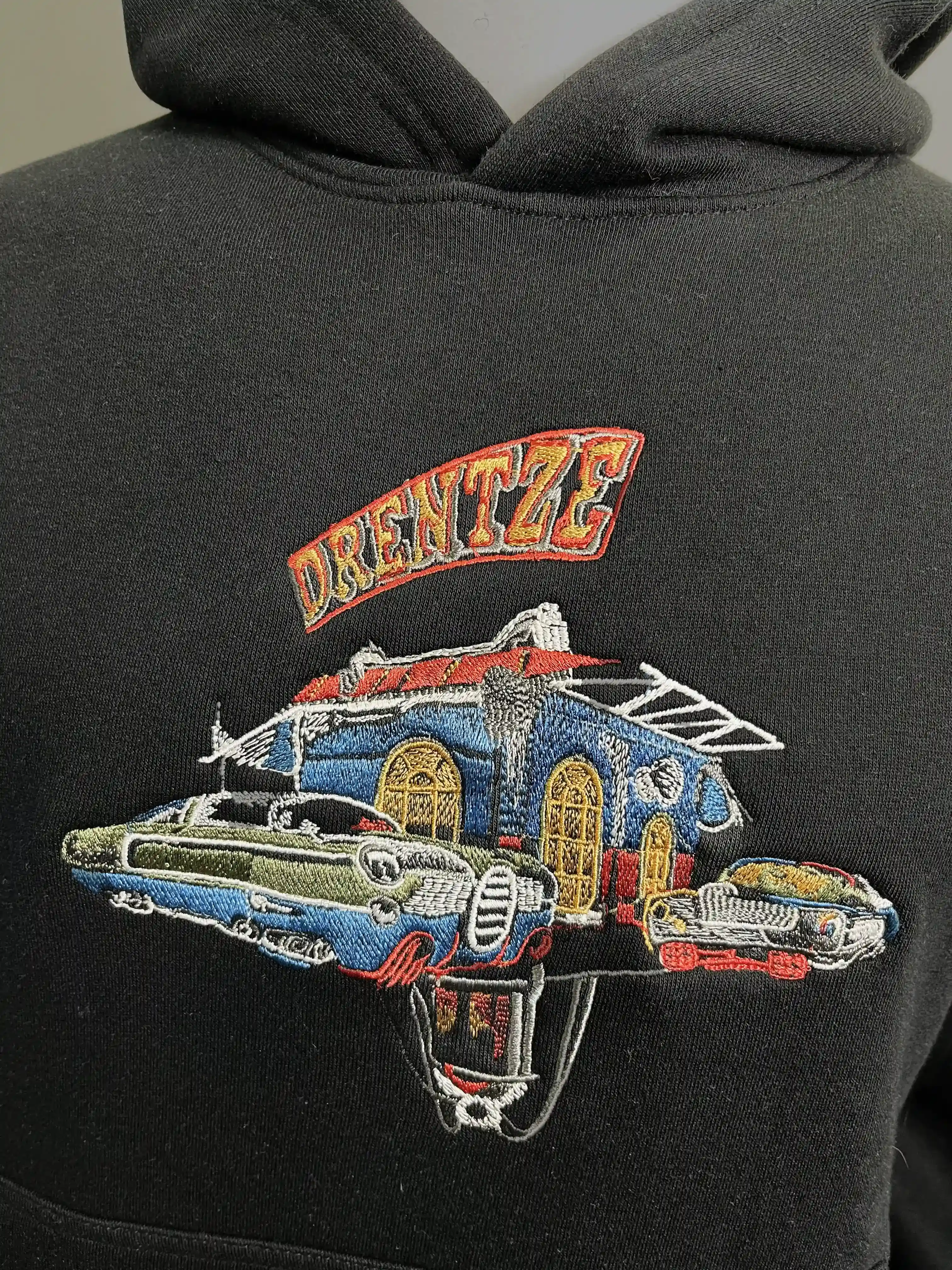 Premium cotton fleece hoodie featuring high-density embroidery details inspired by the retrofuturistic Drentze aesthetic.
